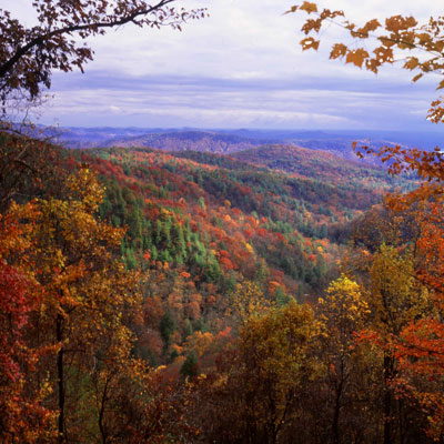 Colorful fall in the Blue-Ridge mountains. This is the view from the Whitewater Falls in Brevard, North Carolina, towards lake Jockassee. Here you can look over the border into South Carolina.(16 MPixels) |